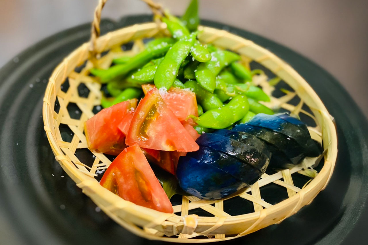 地元・黒埼黒鳥の枝豆、十全ナス、そして冷やしトマト。新潟の夏野菜でつくる、Soiの納涼三点盛。まずは冷たい一皿からどうぞ。