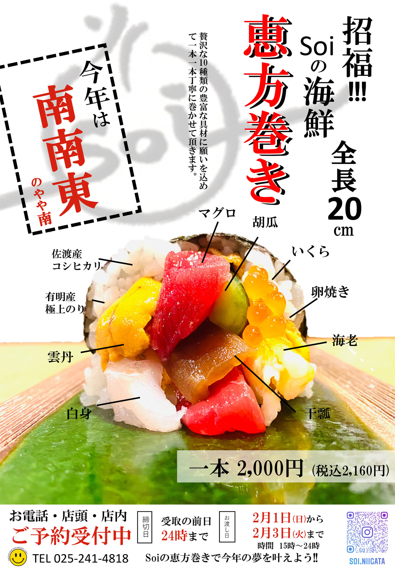 佐渡産コシヒカリ×厳選海鮮の贅沢な一本。招福!「Soiの海鮮恵方巻き」ご予約受付中!